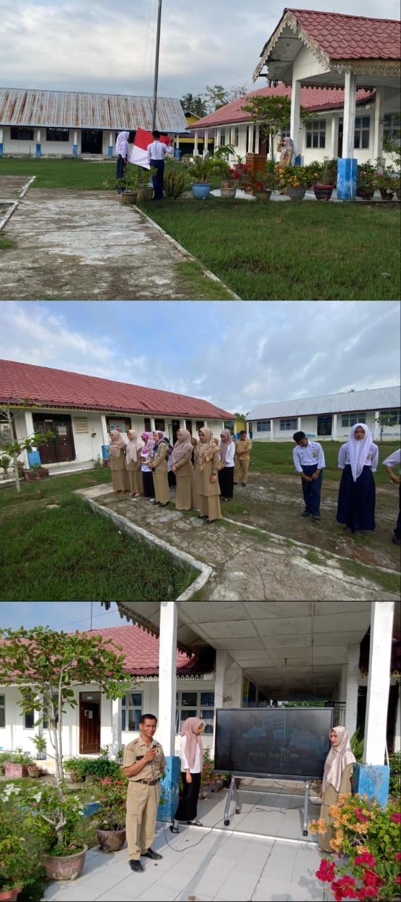 pembina upacara Ibu Kepala Sekolah Aisyahna Humairo dan menyanyikan lagu hari baru Mari kita